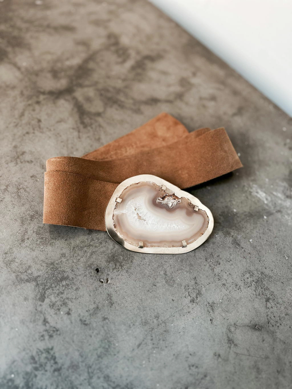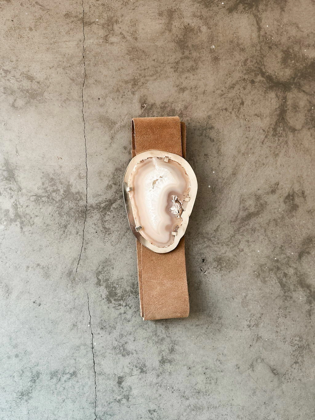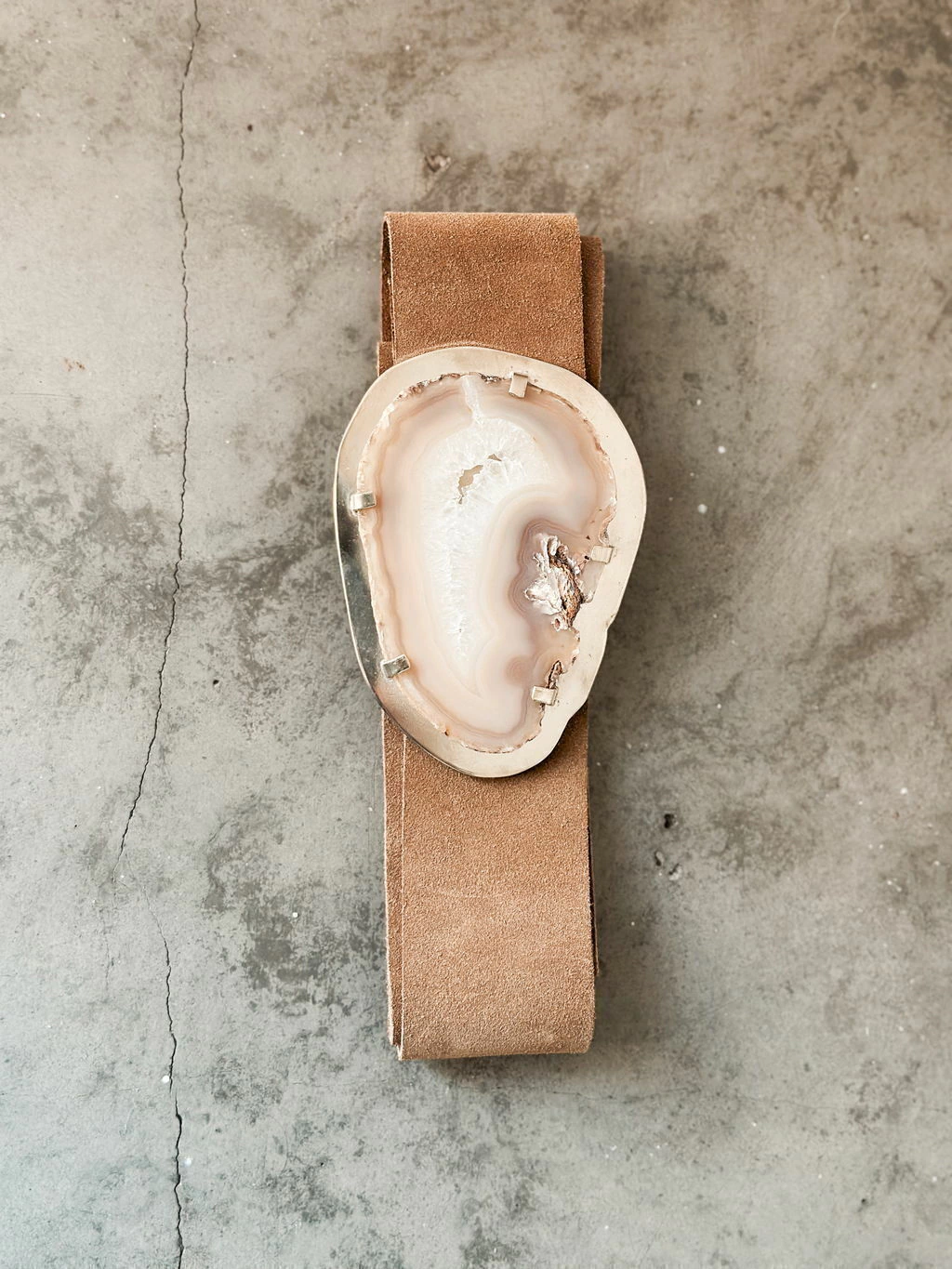 Cinto confeccionado artesanalmente con cuero vacuno (110 cm de largo) y hebilla de bronce & ágata.