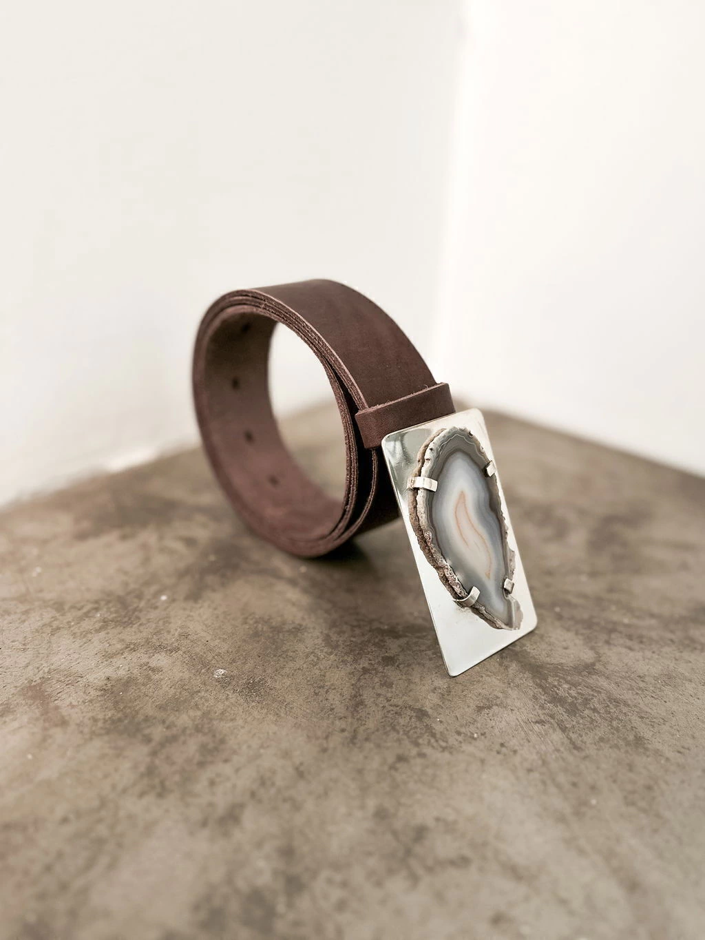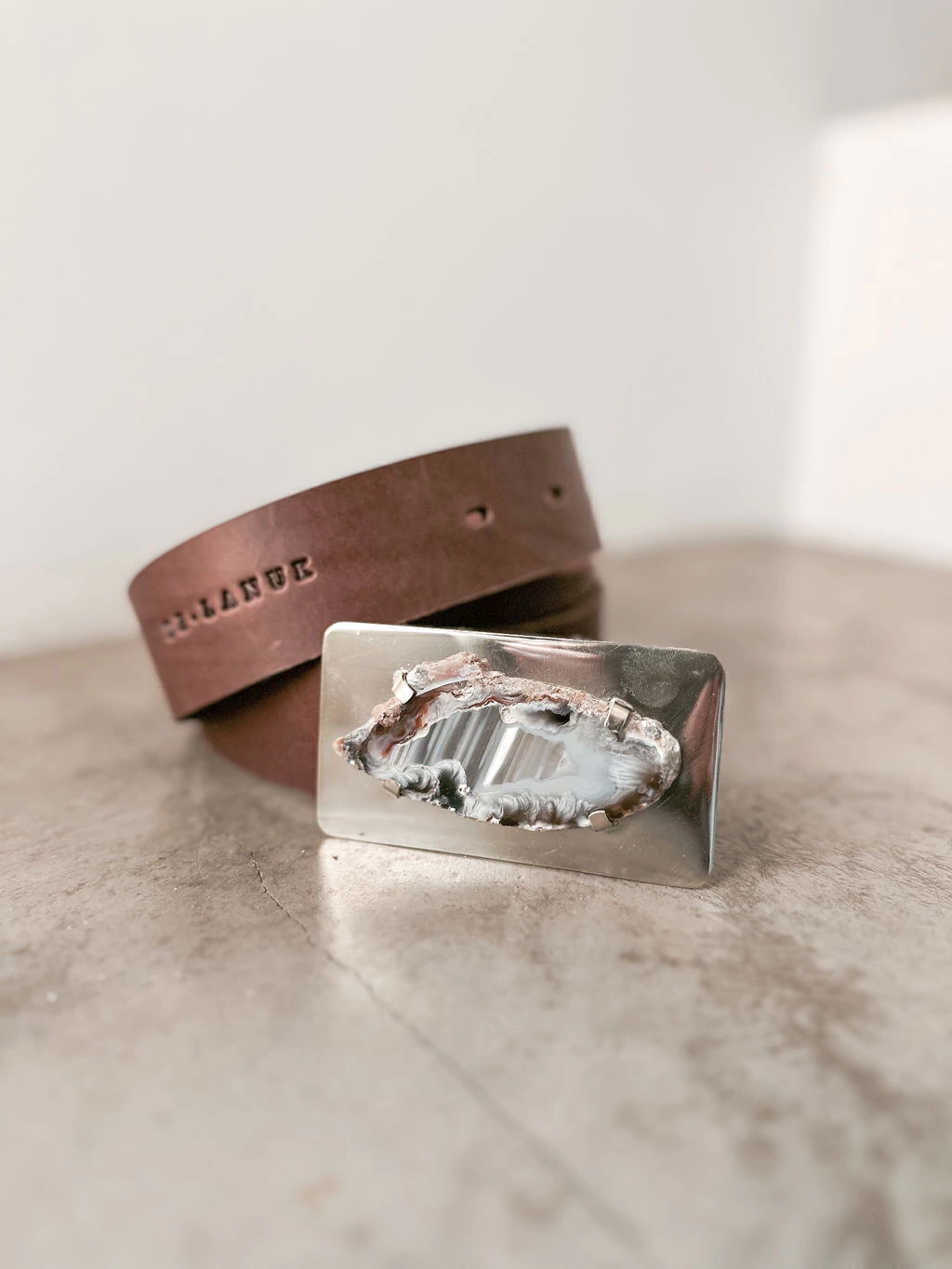 Cinto confeccionado artesanalmente con cuero vacuno (110 cm de largo) y hebilla de alpaca & ágata.