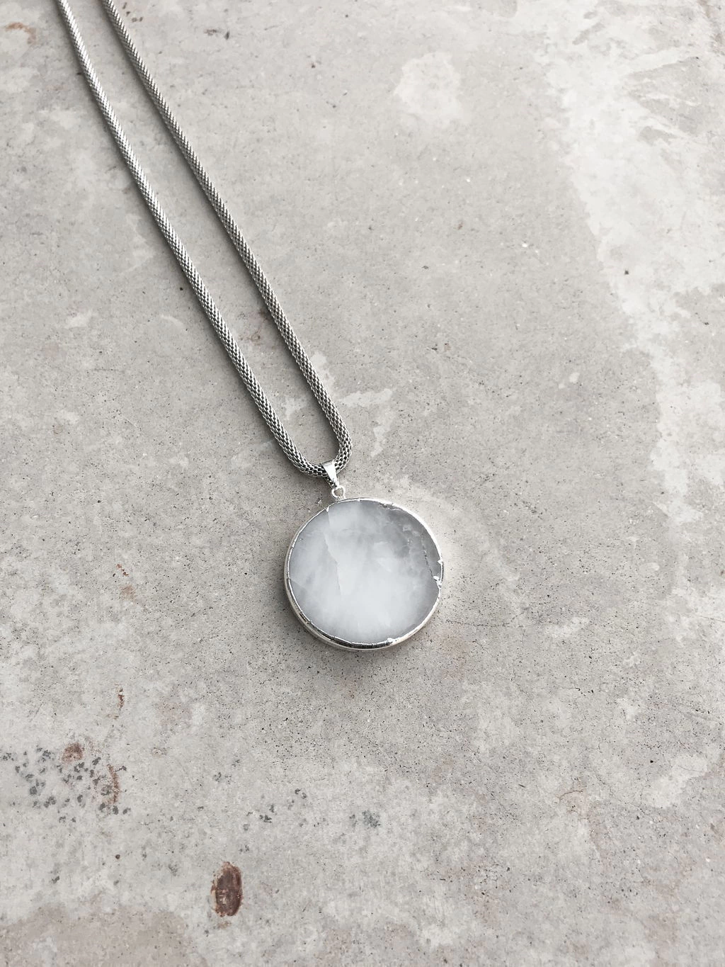 Dije de piedra Cuarzo Blanco redonda tamaño grande (3,7cm de diametro). Con cadena de acero, corta (46 cm) o larga (85cm).