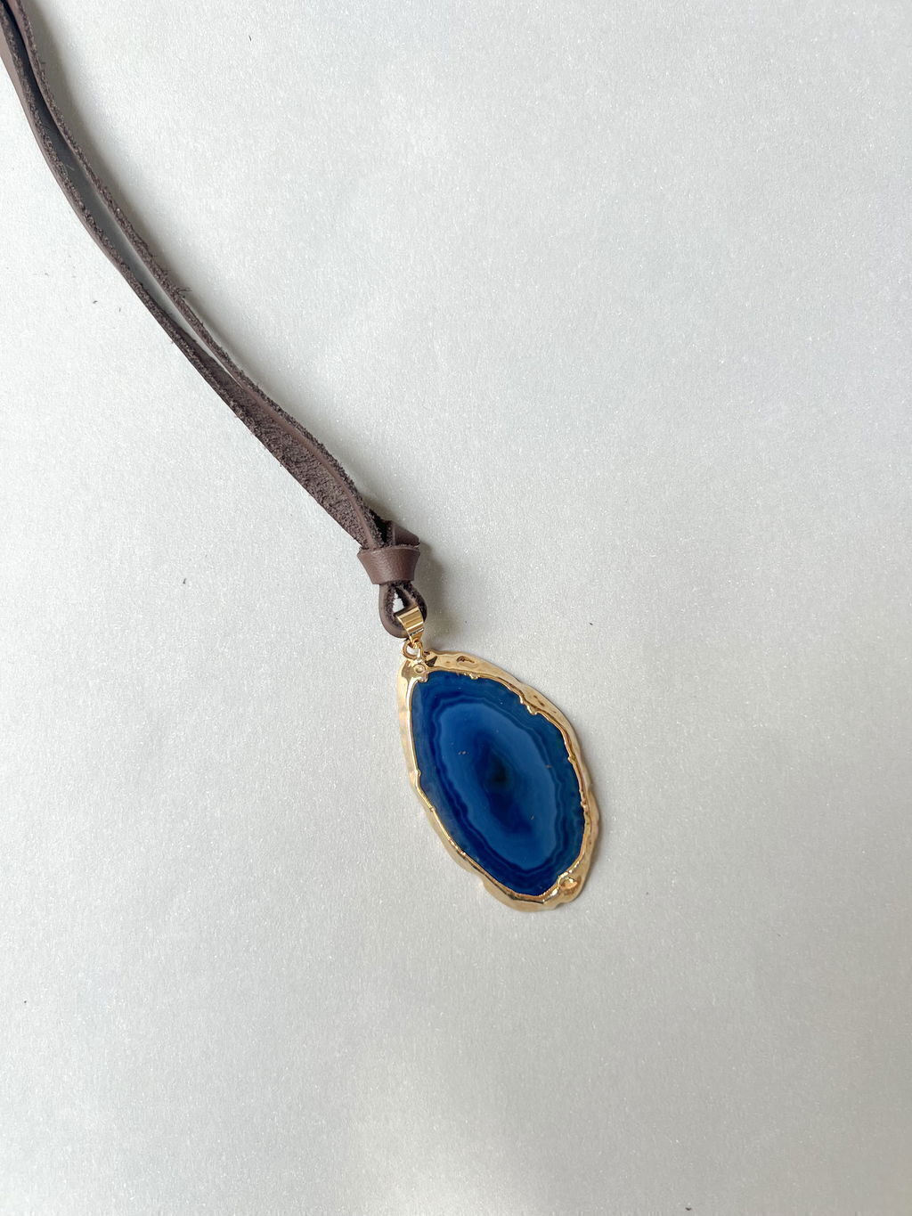 Ágata Azul con baño en Oro y cordón de cuero color marrón, largo regulable.
