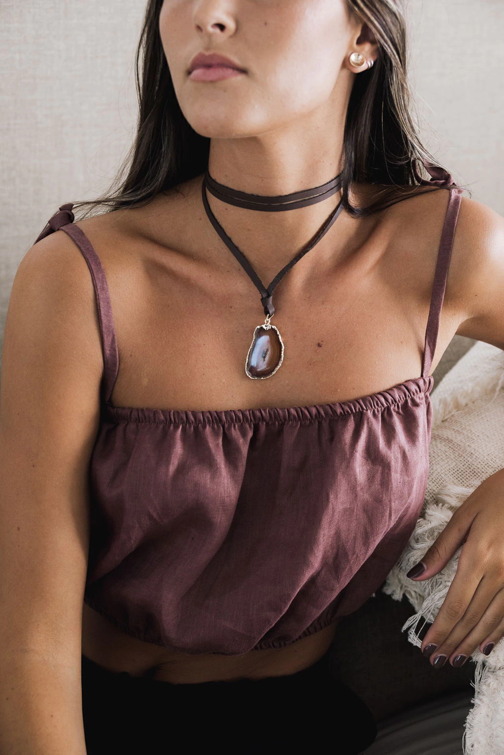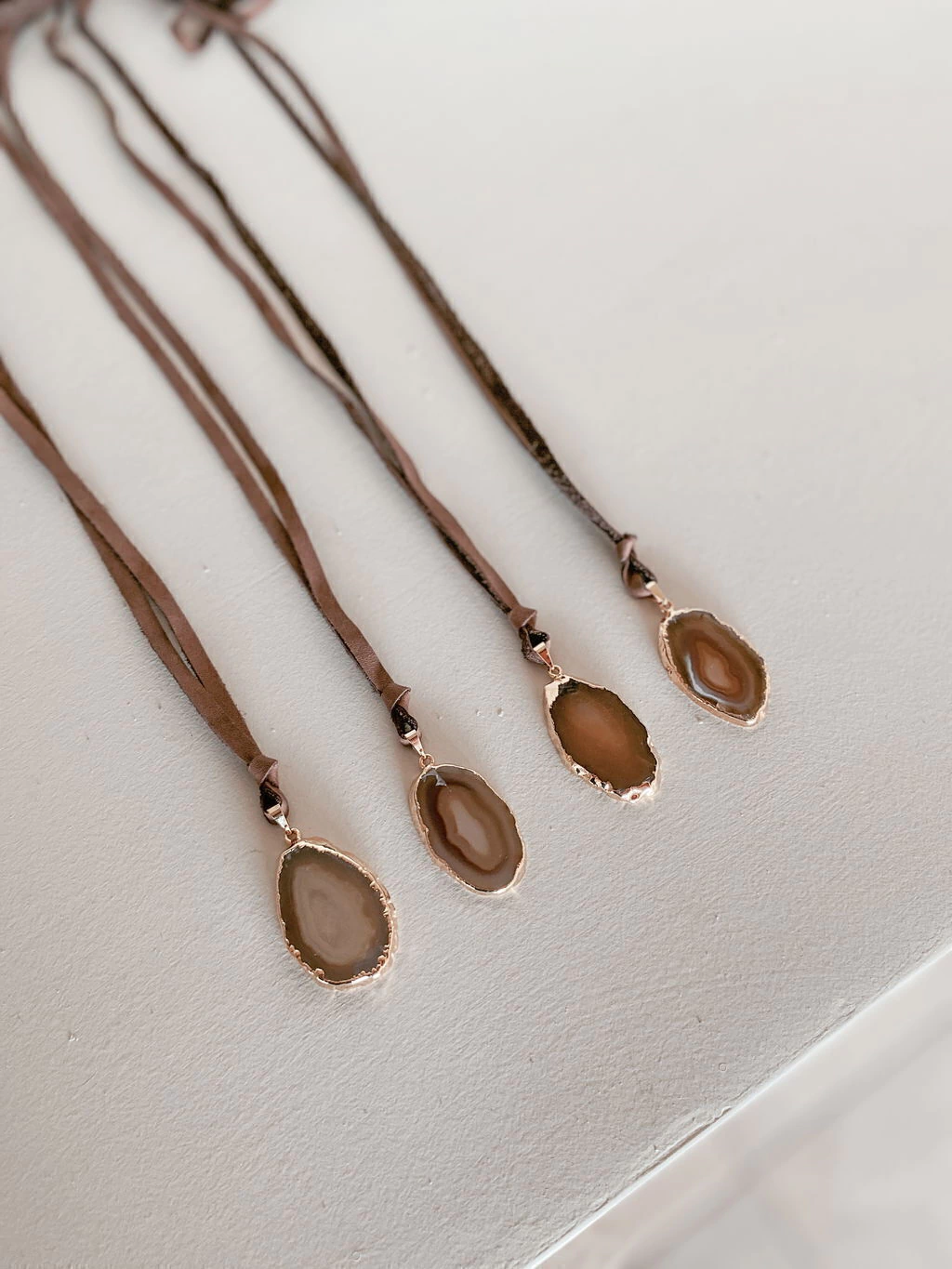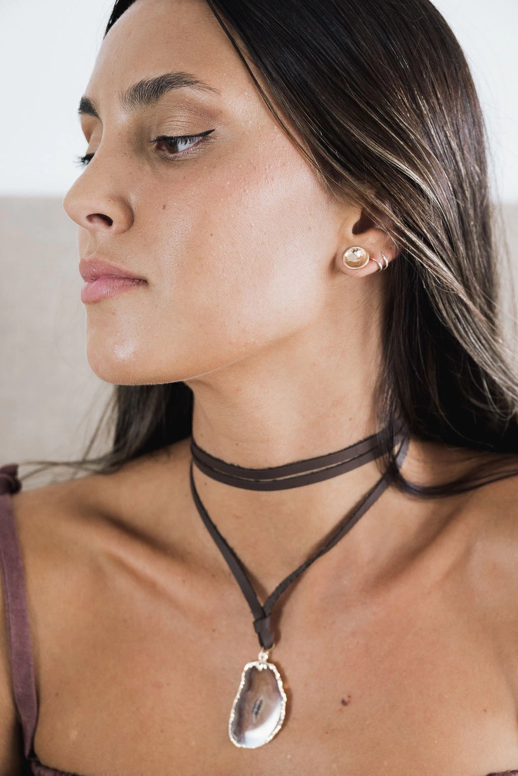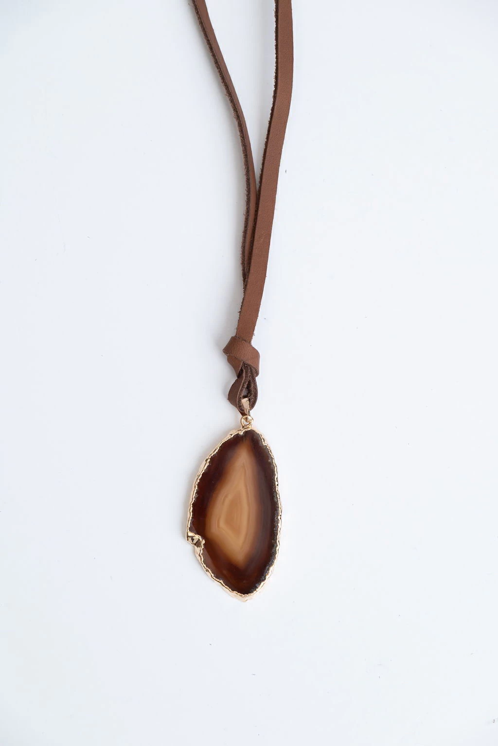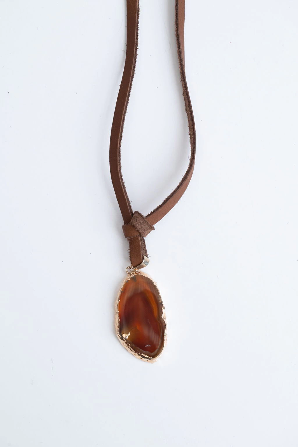 Ágata con baño en Oro y cordón de cuero color marrón, largo regulable.