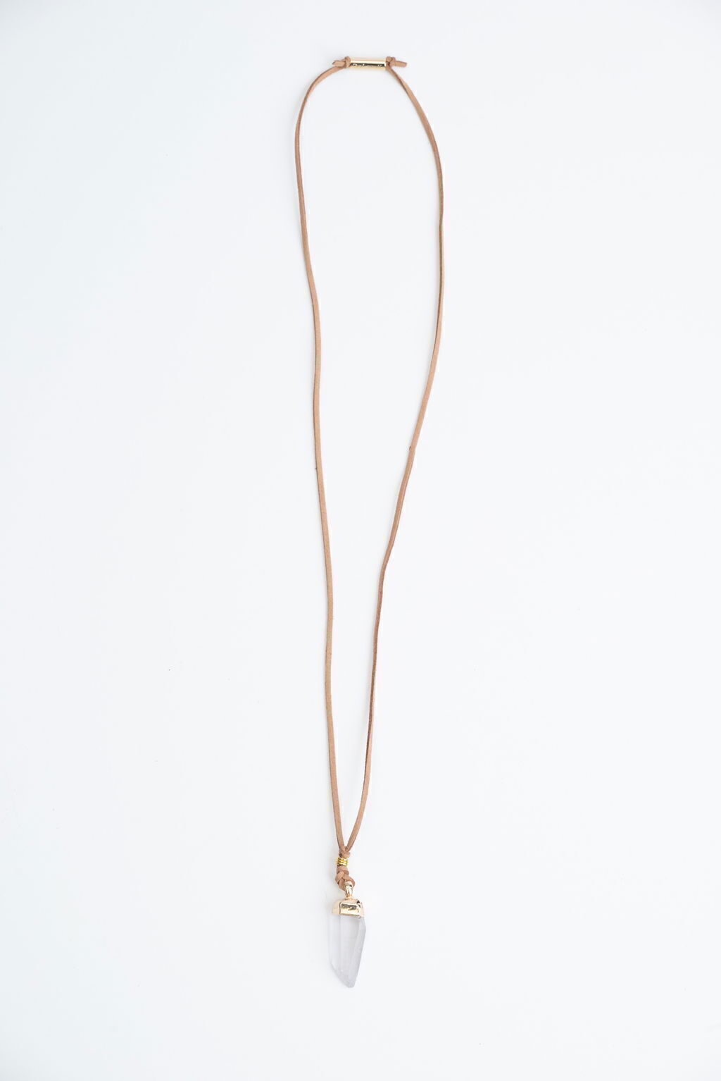 Cuarzo Cristal bañada en Oro y cordón de gamuza color marron, largo regulable.
