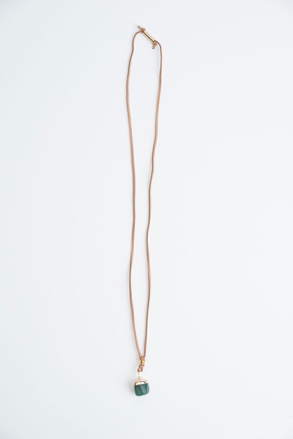 Cuarzo Verde rolada bañada en Oro y cordón de gamuza color suela , largo regulable.