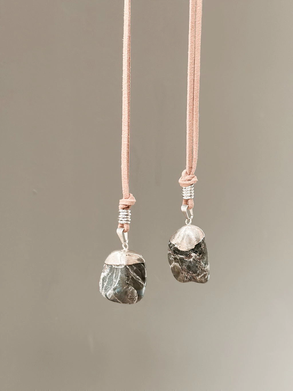 Labradorita rolada con baño en Plata y cordón de gamuza color marrón, largo regulable.