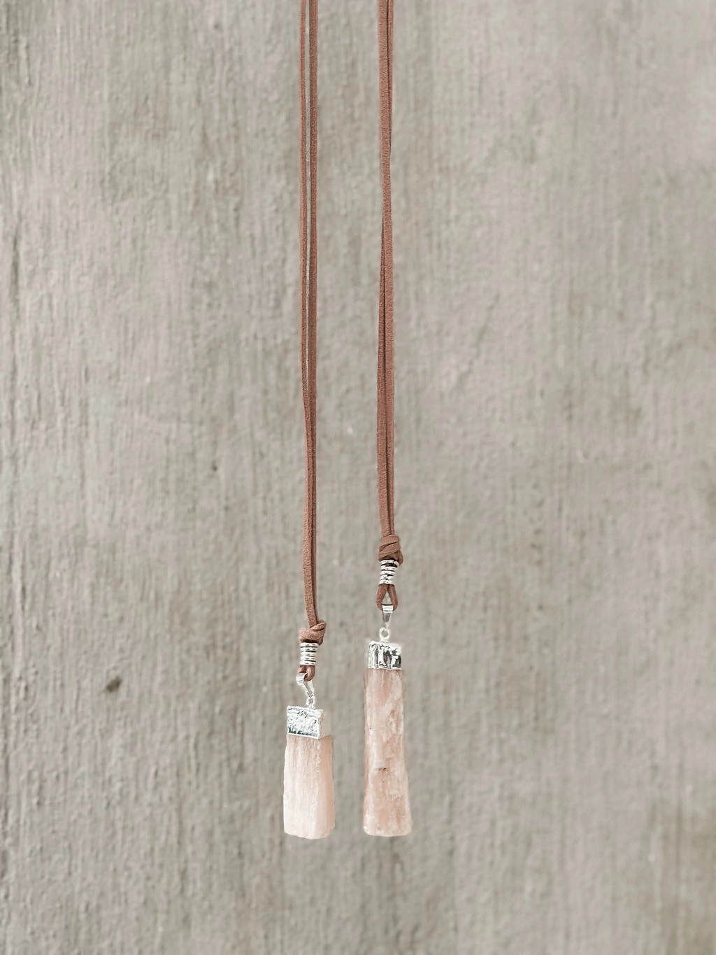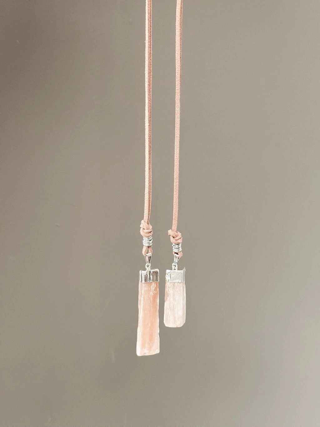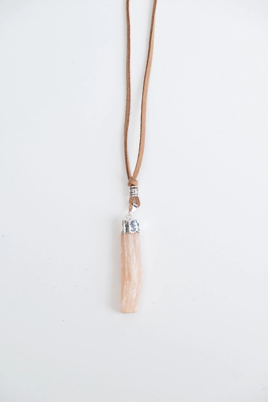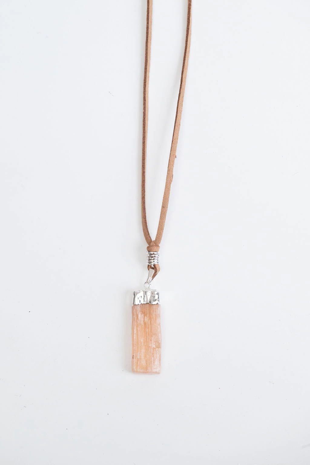 Piedra Selenita Naranja bañada en Plata y collar de gamuza color marrón, largo regulable.